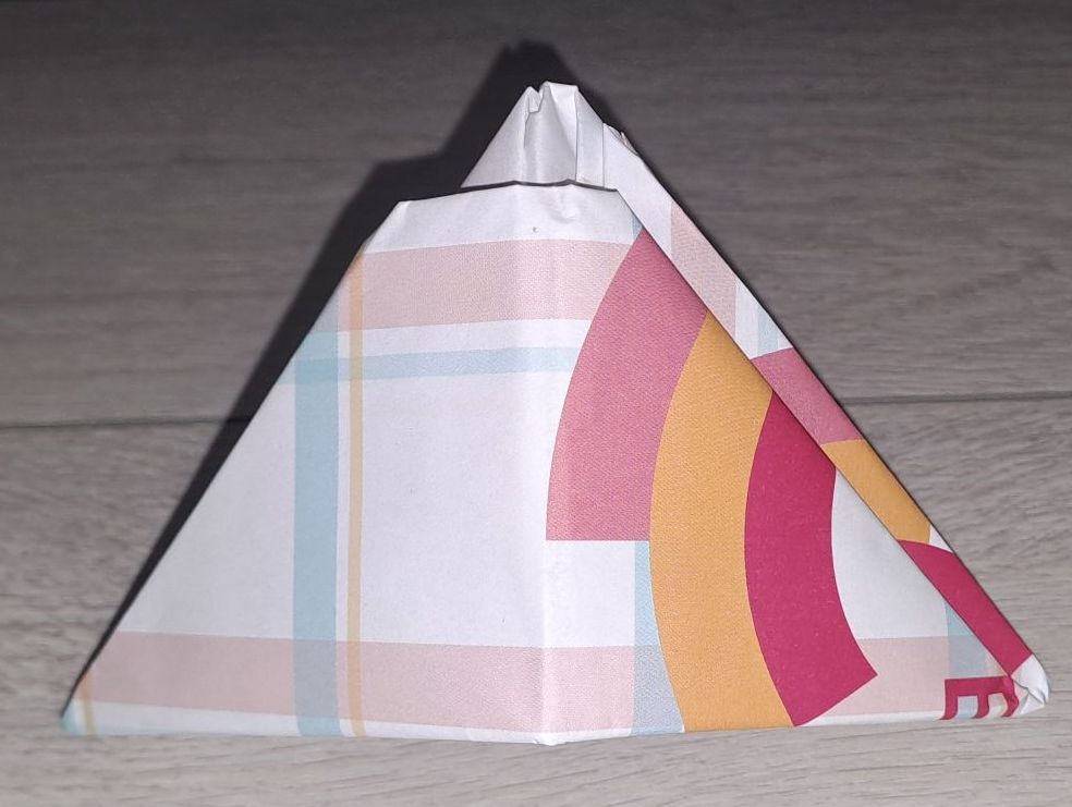 Deze bewoner kreeg nog de medicatie en terwijl ik die geef schuift een bewoonster een netjes in elkaar gevouwen placemat in de vorm van een hoedje naar mij toe.