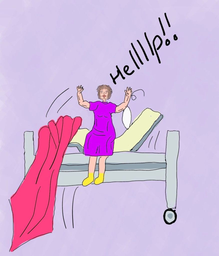 Mw wilde onder geen beding het bed meer in, het bed was duivels en de eerste nachten…..sliep zij zittend op de stoel naast haar bed uit angst om uit bed te vallen.
