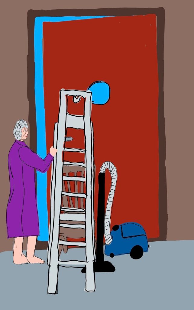 Ik zeg op mijn beurt, maar lieverd je was toch zelf niet op de ladder bezig hoop ik? Nee hoor kom maar kijken. Om mij binnen te laten haalt ze eerst de ladder weg, dan de stofzuiger, dan een krukje, dan een stoel en ze verschuift een kastje.