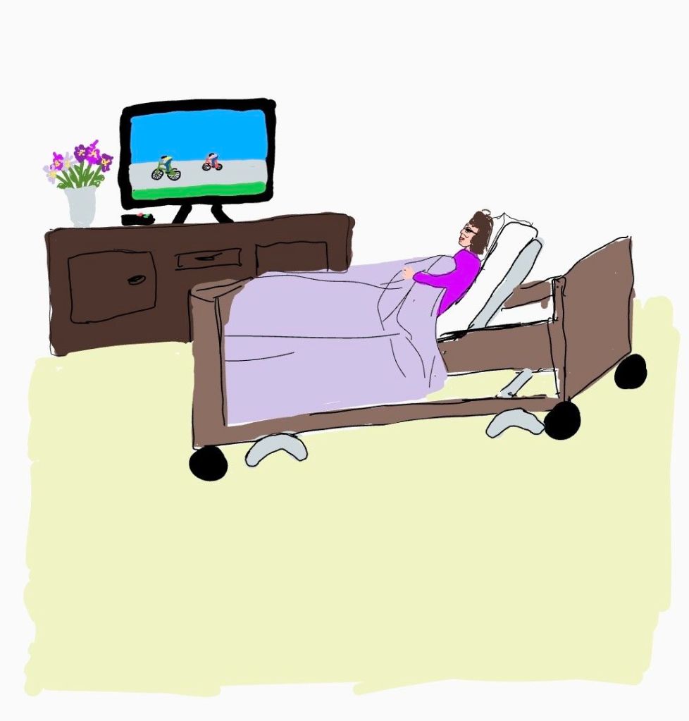 Wel besloten we bewoonster eerst mee te nemen naar de gezamelijke woonkamer, daar koffie, later een lunch en toen heb ik haar daarna met andere collega naar haar eigen verbouwde woonkamer gebracht. TV aan op eurosport met toevallig 1 van haar favorieten wielrennen er op.